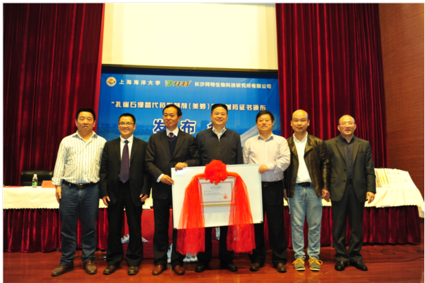 此后,beat365中文唯一官网与长沙拜特生物科技研究所有限公司合作,在历经16项药理学实验、7项临床试验、8年生产性验证与应用、3年多轮每次由20余名行业专家的新药评审后,最终获得了世界上第一个专门用于水霉病治疗的孔雀石绿替代药物制剂。这个新兽药证书,也是自国务院《新兽药管理条例》(2004年3月24日国务院第404号令)发布后我国第一个关于水产用的有关化学的新兽药证书。