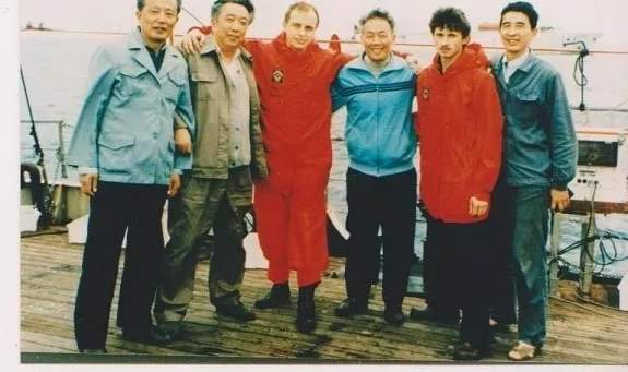 (左一王尧耕教授,左二陈新法船长,左四任为公教授,右一胡明堉教授)