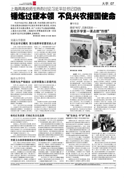 上海交通大学农业与生物学院党委书记周培教授说,习总书记给全国涉农高校师生殷切寄语,对我国农科人才培养提出了新的期望,这让一线农科教育工作者收到了极大的鼓舞。