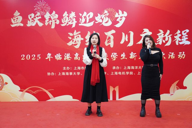 来自“一带一路”沿线国家的留学生代表与中国学生共同表演《上春山》,庆祝中国年的到来。抽奖环节更是将现场气氛推向高潮,市教委领导和临港五校领导分别为留校师生抽取幸运号码,并送上新年祝福和精美礼物,让大家感受到了浓浓的年味和深深的关怀。