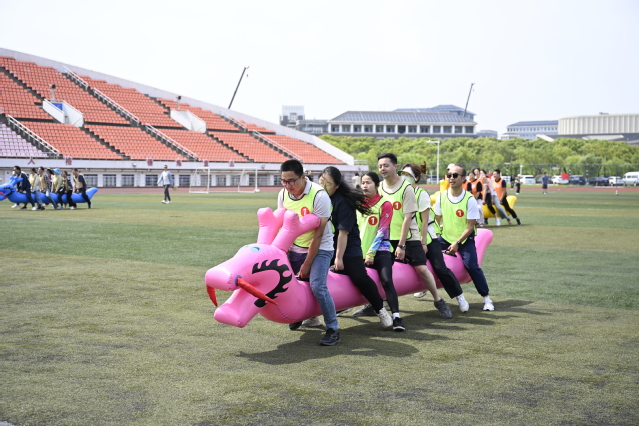 现场,活力四射的学生啦啦操表演精彩登场,出席开幕式的领导和教师们在“九宫格飞盘”体验活动热身后,教职工趣味运动会拉开了帷幕。平日严谨治学的教职工们脱下正装,化身运动健将,在充满趣味的比赛项目中挥洒汗水,展现别样风采。本届趣味运动会保留深受教职工喜爱的团队项目“旱地龙舟”“胸背夹球”,并得到了“浦工乐学”文化配送服务的支持,新增“吸盘射箭”“合力筑塔”两项当前比较流行的团建活动,展现的就是运动员之间的配合和默契,让更多的老师在活动中提高团队协作的意识,增进交流,同时,也达到了锻炼身体的目的。
