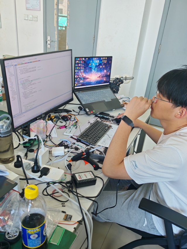 选择科创,就意味着要同时应对学业和科创的双重压力。有了蓝桥杯国赛获奖的经历,在大二,潘金铎积极报名参加各种比赛,从智能车竞赛到大学生电子设计竞赛,再到创造杯、节能减排大赛,甚至数学建模竞赛和工业工程应用与创新大赛。当同学们都在忙着复习考试时,潘金铎还要抽时间写项目计划书。项目里的每个环节对他来说都是全新的挑战,他深刻认识到团队的重要性,大家一起攻克难题,虽然过程很辛苦,但科创的魅力让他深深着迷。在智能车备赛正值暑假,他毫不犹豫地选择留校和队友们日夜相伴,实验室成了他们的第二个家,从采购元器件到设计电路板,再到组装调试,每一个小小的突破都让他欣喜不已。赛前那个不眠之夜,他们忙着调试参数,一直忙到天亮。虽然疲惫,但那份投入的热情让他忘却了困倦。是团队的相互支持和无数次“我们再试一次”的坚持,是绝不认输的倔强,支撑着他一路向前。最终,他们在华东赛区获得了三等奖。
