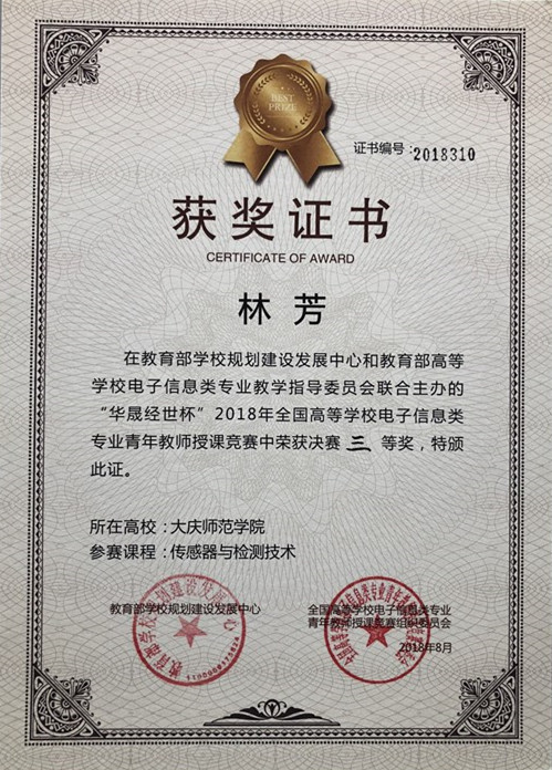2018年8月30日,由教育部学校规划建设发展中心、教育部高等学校电子信息类专业教学指导委员会联合主办的“华晟经世杯”2018年全国高等学校电子信息类专业青年教师授课竞赛,在河北工业大学举行决赛。本次竞赛从2018年1月份开始,历时8个月,全国100多所高校,包括南京邮电大学、国防科技大学和哈尔滨工程大学等电子信息类知名大学,400多名教师报名参赛。澳门pg澳门pg官方电子平台林芳老师在获得初赛华北赛区二等奖后,在决赛中获得全国三等奖。