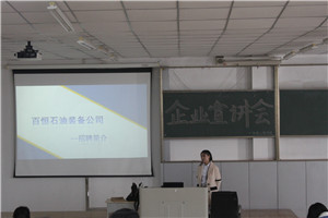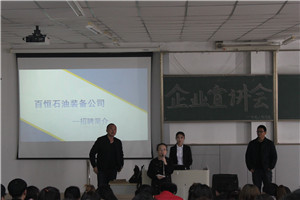 为引导同学们了解用人单位所需人才类型,强化提升学生面试能力。澳门pg官方电子平台于3月21日13:30分,在主楼2-1教室组织举行学生就业招聘会宣讲。由百恒石油责任有限公司的代表杨建国和杜慧敏为澳门pg官方电子平台的同学进行宣讲。