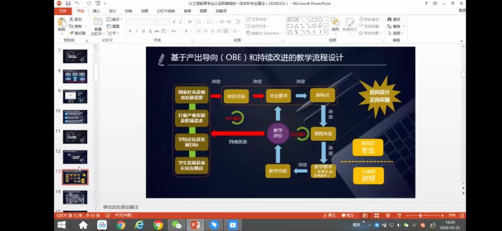 此次培训会上,陈国峰教授从工程教育认证的现状与趋势、工程教育认证与一流本科专业建设、基于OBE模式的专业建设实施路径到提升专业建设水平的思考与建议、2020年工程教育专业认证申报着力点和具体工作建议等方面展开培训。整个培训内容以理论讲解为主,以实际案例为辅,深入浅出。从工程认证中涉及到的宏观层面的7个部分,到具体层面的人才培养方案的制定,再到教学大纲的修订、成绩的评定标准、课程达成度的计算等。系统阐述了以OBE理念为基础,做好工程教育专业认证的路径、方法和措施。