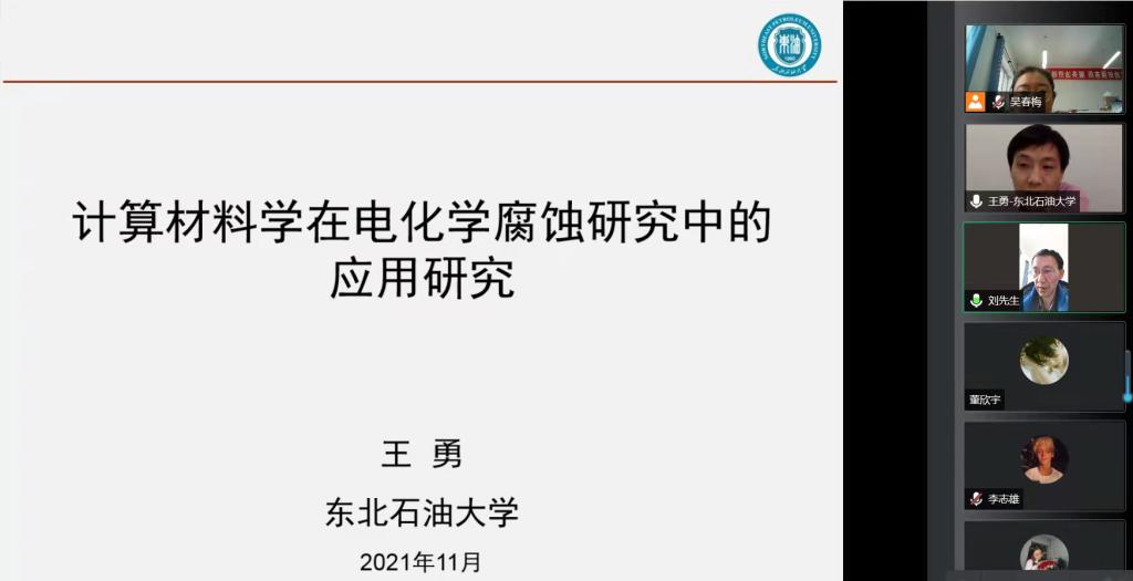 2021年11月16日下午,东北石油大学材料系教授、博导,黑龙江省级领军人才梯队后备带头人王勇教授受邀作题为“计算材料学在电化学腐蚀研究中的应用研究”学术讲座。讲座采用腾讯线上会议形式举行,澳门pg官方电子平台副院长刘开绪教授主持,澳门pg官方电子平台、化学工程学院教师及学生等60人参加。