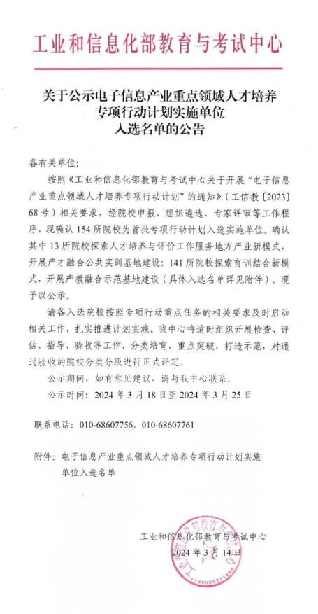 近日,工业和信息化部教育与考试中心公示了电子信息产业重点领域人才培养专项行动计划实施单位入选名单,澳门pg经过激烈的申报竞争和线上答辩,成功入选首批拟建产教融合示范基地实施单位。