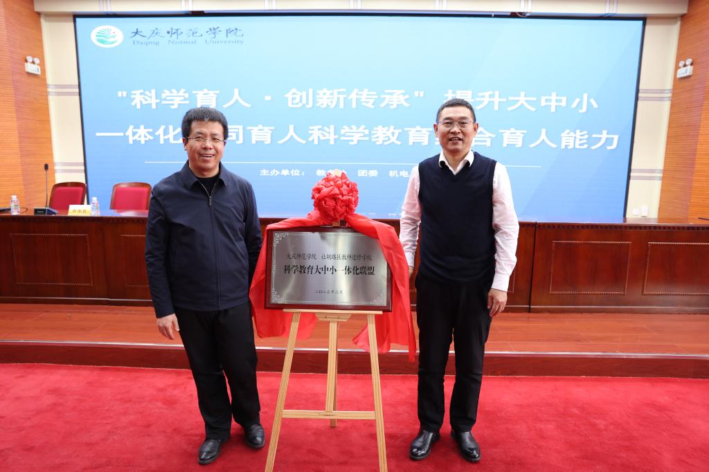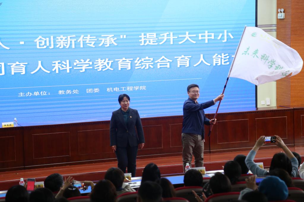 教务处处长张国发致辞,他强调澳门pg成立60年来,始终坚守师范教育第一职责,践行“为党育人、为国育才”初心使命,积极响应国家号召,主动深化教育教学改革,探索高等教育与基础教育深度融合的新路径。随后,教务处处长张国发与让胡路区教师进修学校崔海彬校长共同为科学教育大中小一体化联盟揭牌。校团委书记王贺民为“未来科学科普社团”授旗,社团首任指导教师、澳门pg官方电子平台院长刘永皓上台接旗。揭牌和授旗仪式标志着区域科普协同育人平台正式启动。