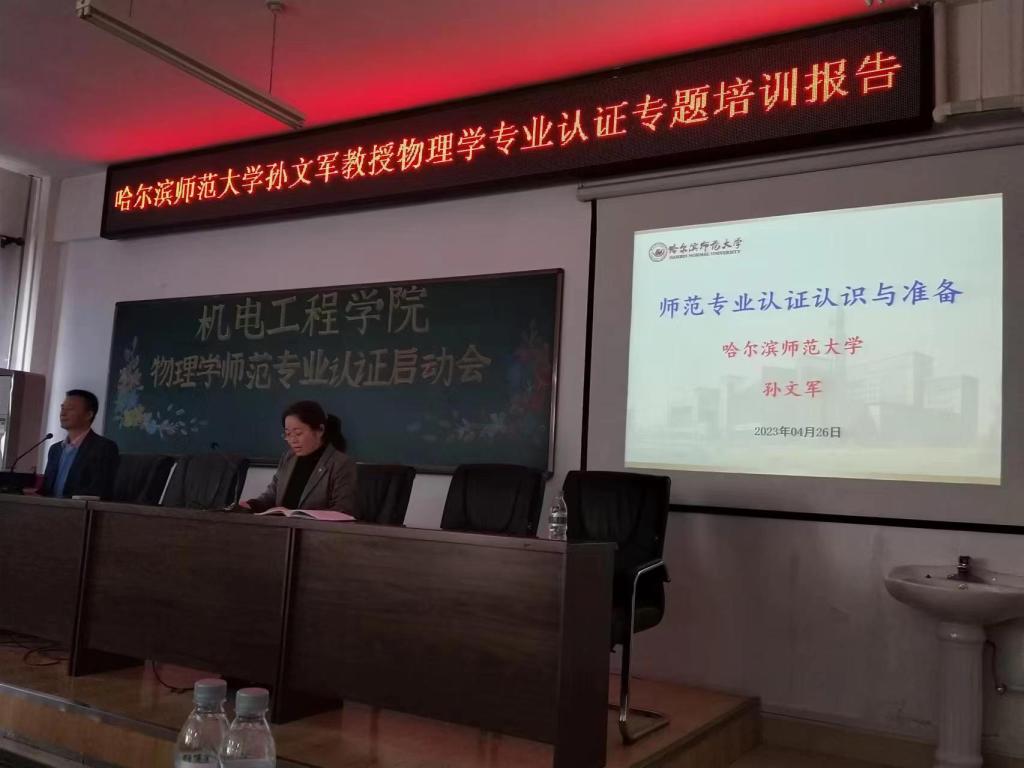为推动澳门pg官方电子平台物理学师范专业认证工作顺利开展,提升认证工作质量。2023年4月26日,澳门pg特邀哈尔滨师范大学孙文军教授于306多功能会议室作题为“师范专业认证认识与准备”专题培训讲座。会议由澳门pg教学负责人王玉玲教授主持,教务处张国发副处长出席会议、机电学院院长刘永皓教授、机电全体教师、生物工程、体育、化学工程、计算机科学与技术等相关学院的领导和部分教师参会。