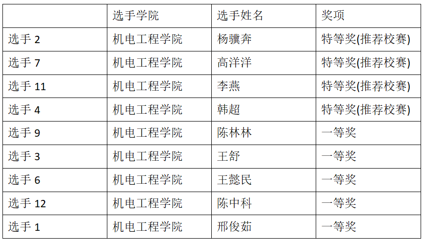 此次选拔赛分教学设计、说课及模拟授课三个环节,各位评委老师根据评分标准对参赛选手课堂教学综合技能进行公平公正的评分,12位参赛选手紧张激烈的角逐,选拔出特等奖4项并推荐校赛,一等奖5项,最终排名如下: