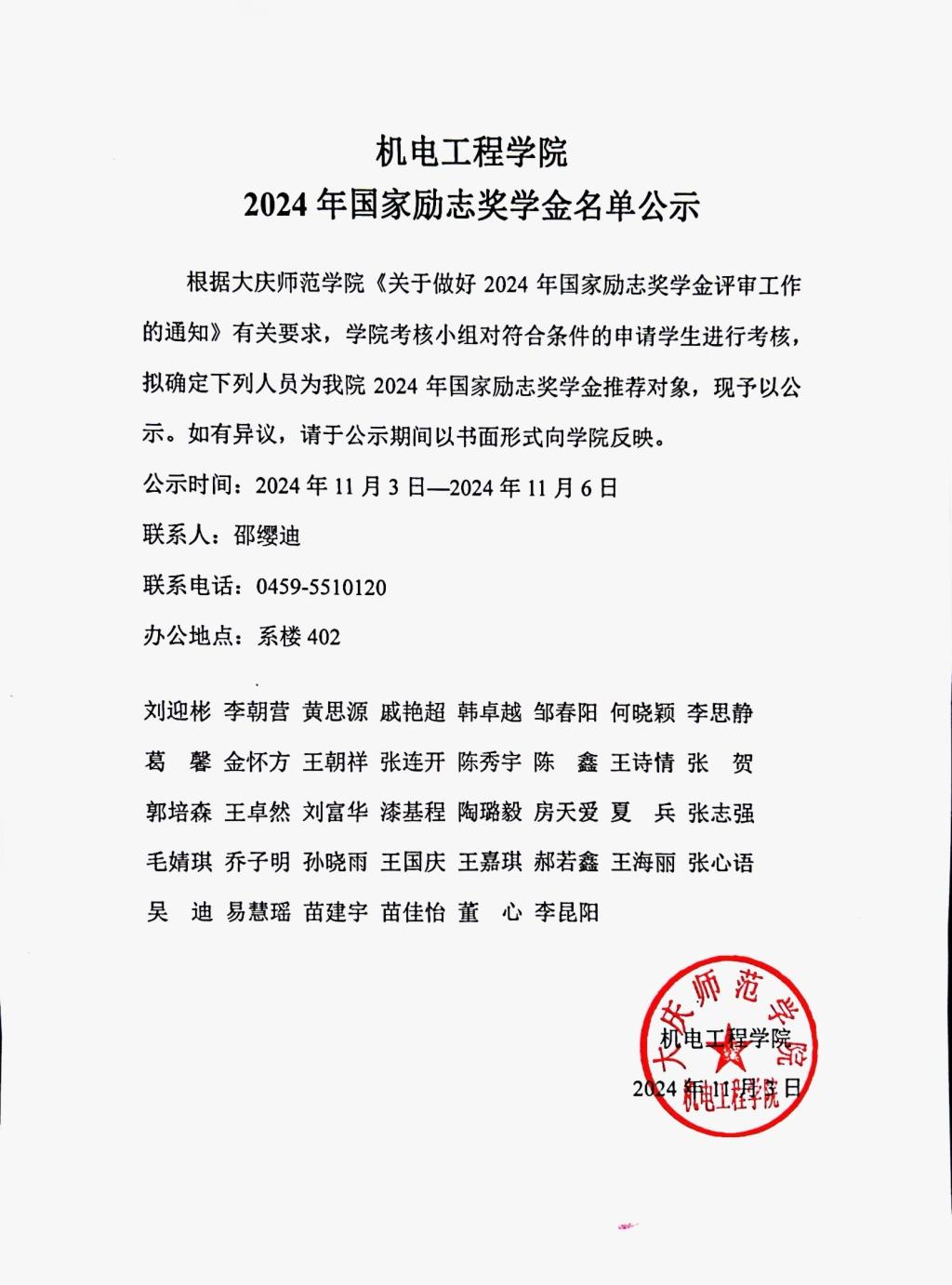 澳门pg官方电子平台2024年国家励志奖学金公示名单公示