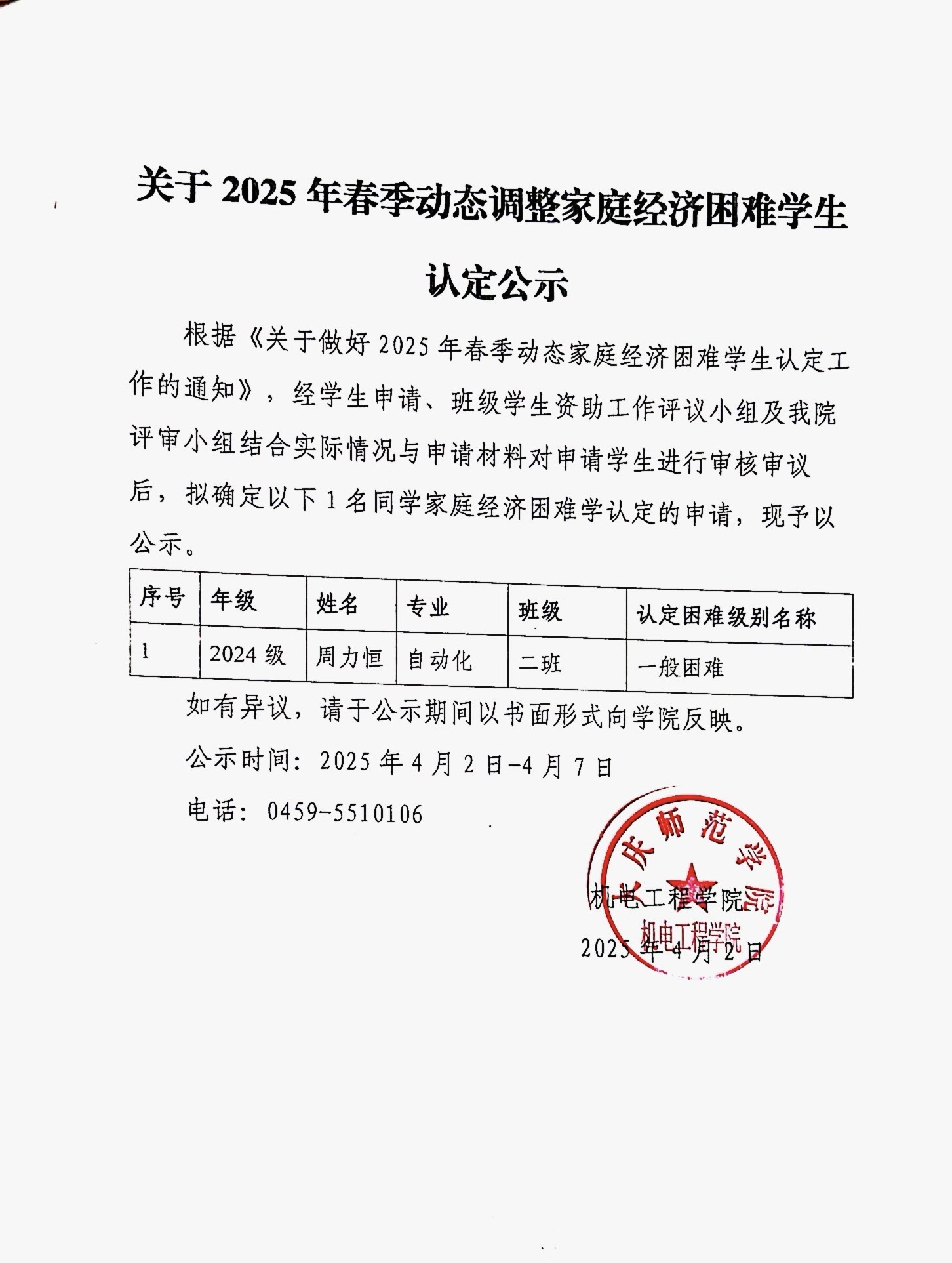澳门pg官方电子平台2024-2025春季学期动态调整家庭经济困难学生认定公示