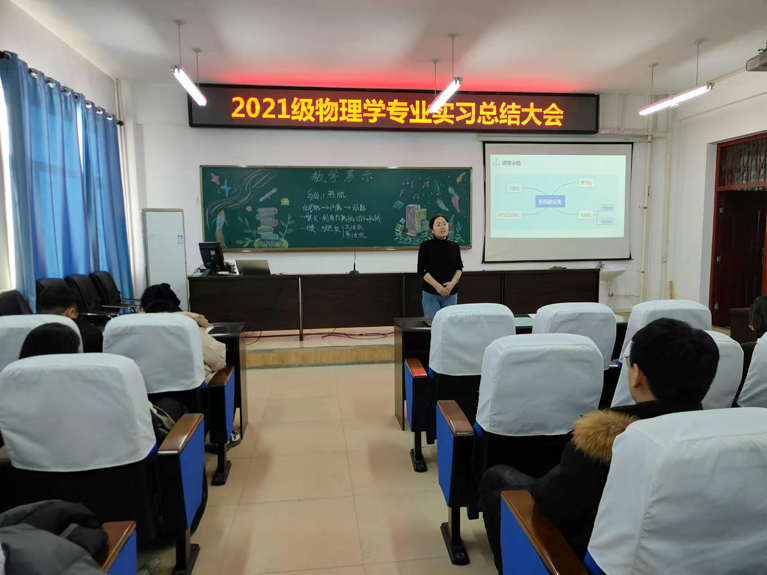 12月24日,澳门pg官方电子平台召开2021级物理学专业教育实习总结大会,机电工程学院教学副院长王玉玲、实习指导教师任艳东、崔海瑛、李秀明、郝淑娟及物理学专业教师和2021级物理学专业全体同学出席本次会议,会议由物理学专业负责人杨瑞老师主持。