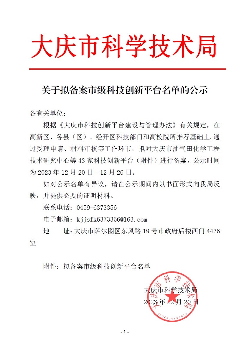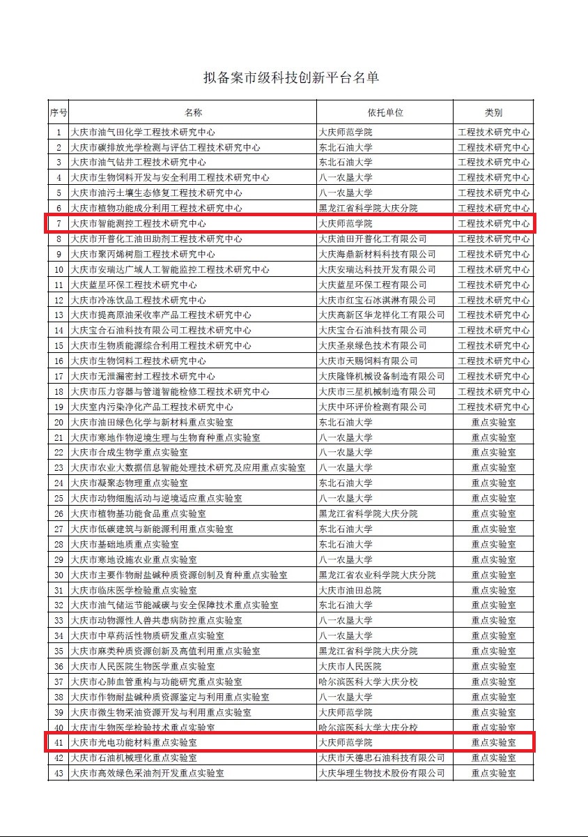 近日,大庆市科学技术局公布了市级科技创新平台名单,全市合计43家科技创新平台入选。澳门pg申报的“大庆市智能测控工程技术研究中心”、“大庆市光电功能材料重点实验室”成功获批备案。