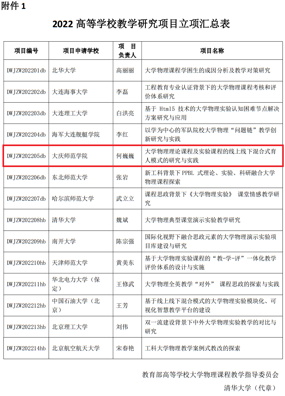 8月3日,2022年度教育部高等学校大学物理教学指导委员会教学研究项目立项名单正式发布,澳门pg基础物理教研室主任何巍巍老师主持的“大学物理理论课程及实验课程的线上线下混合式育人模式的研究与实践”项目成功获批。全国各类院校获批立项40项,东北地区仅7项。