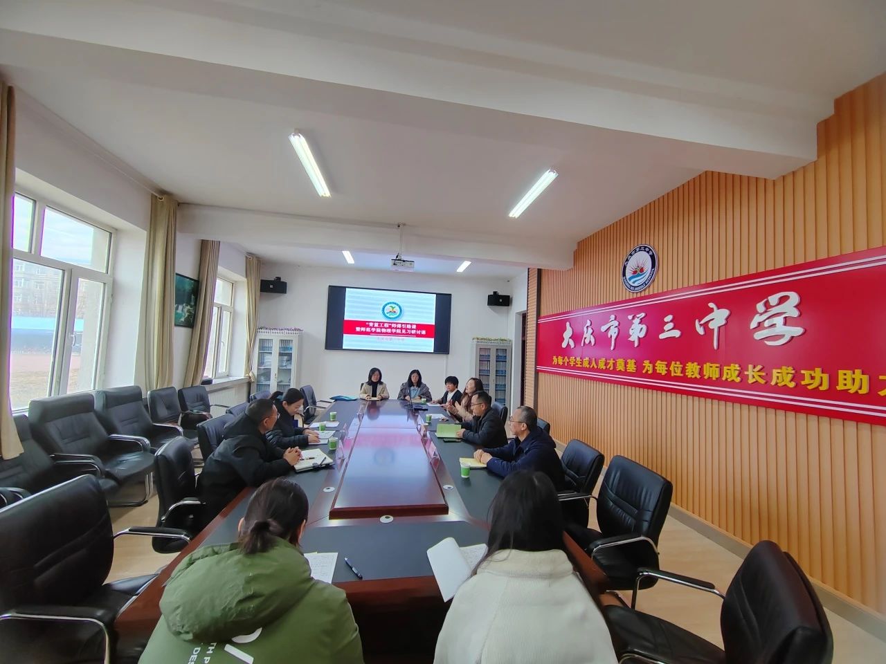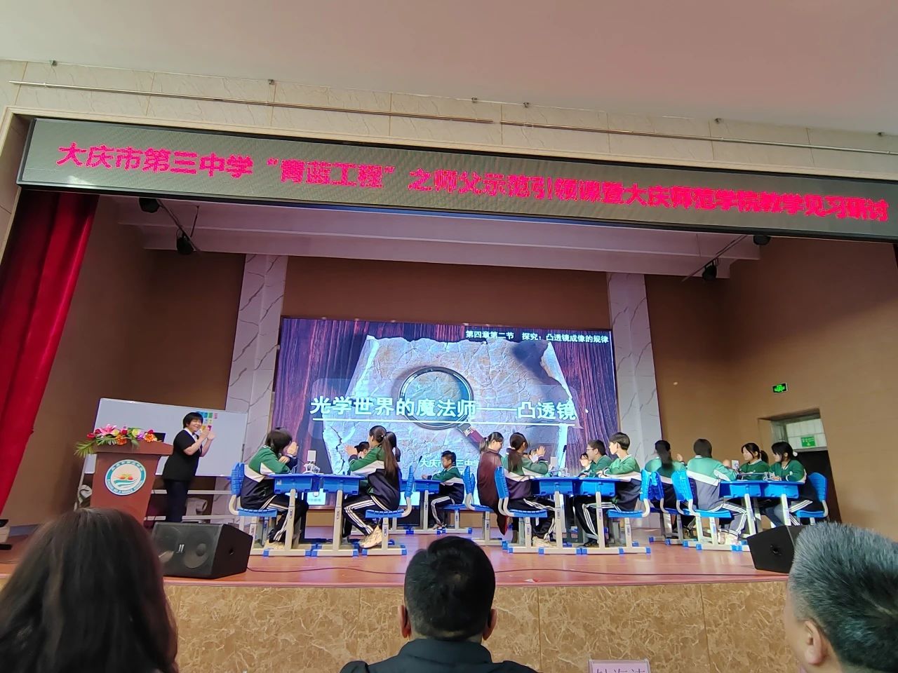 启动会后,王玉玲副院长带领22级物理学专业指导教师及22级物理学专业全体同学赴大庆市第三中学进行教育见习。本次活动大庆市第三中学高度重视、将教育见习与大庆市第三中学“青蓝工程”之师父引领示范课堂活动相结合、大庆市让胡路区教育局副局长钟海涛、让胡路区进修校校长崔海彬、副校长潘明浩、大庆市第三中学学校长高峰、副校长刘鋆星出席此次活动。