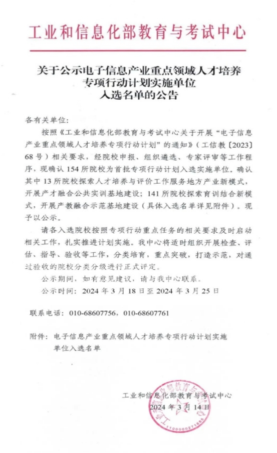 近日,工业和信息化部教育与考试中心公示了电子信息产业重点领域人才培养专项行动计划实施单位入选名单,澳门pg官方电子平台经过申报竞争和线上答辩,成功入选首批拟建产教融合示范基地实施单位。