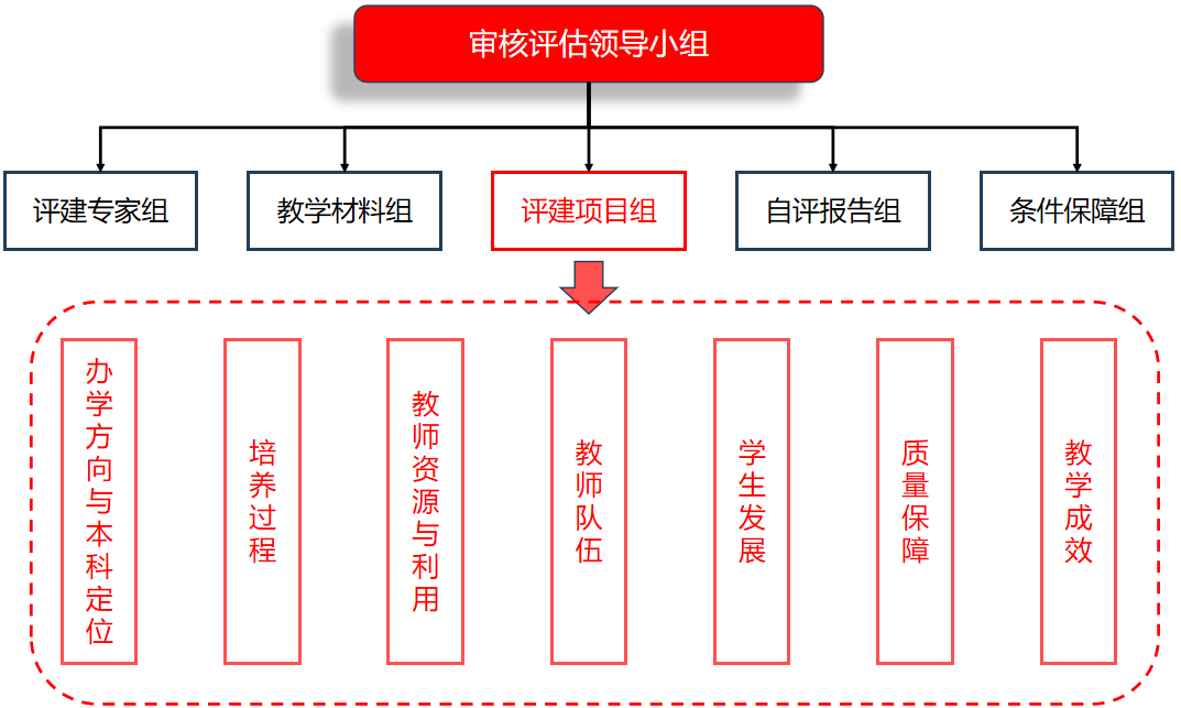 按审核评估要素,对应学校的机构设置,成立7个项目工作组(请各系参考学院的项目工作组,进行任务详细分解),组长牵头,组内实行分工负责制,由组长根据工作需要对组内各成员分派工作任务,并分工合作,负责撰写《分项自评报告》,并提供各分项目所需支撑材料。